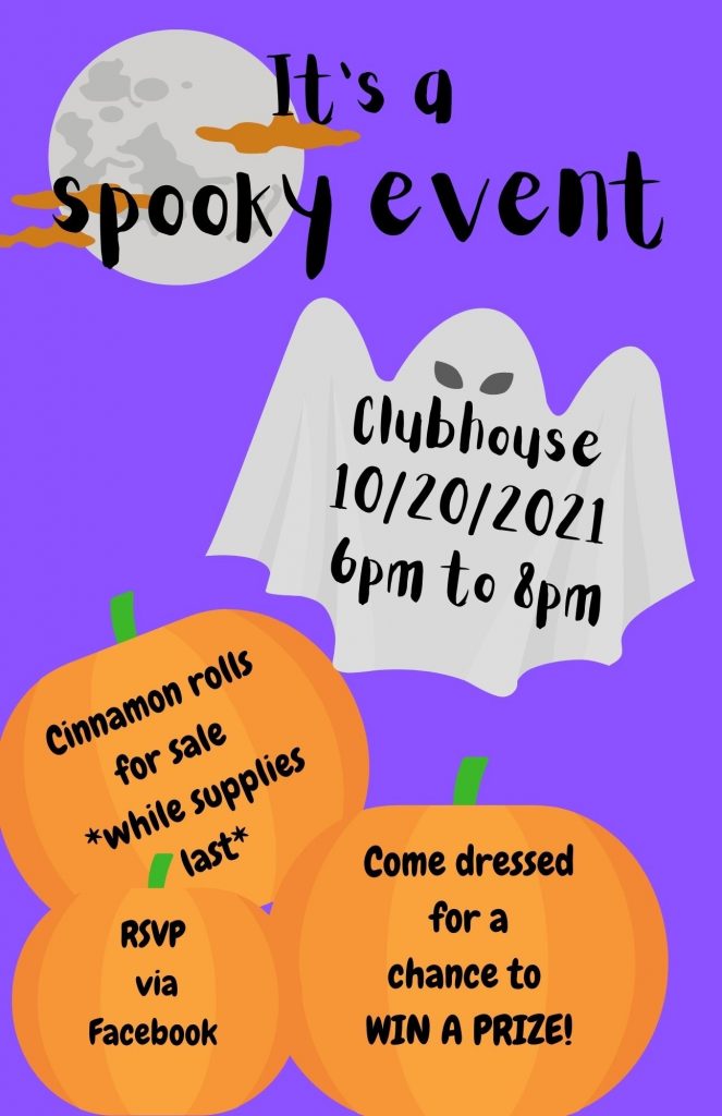 Presented by the Social Committee: It’s a Spooky Event. Come and join us on October 20th, in the clubhouse.